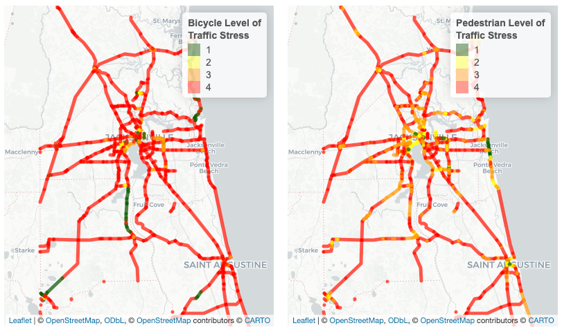 The Bicycle and Pedestrian Level of Stress Maps from the North Florida TPO Annual Mobility Report show the degree of traffic stress (1=lowest to 4=highest) based on comfort factors such as pavement condition, heavy vehicle presence and facilities at intersections.