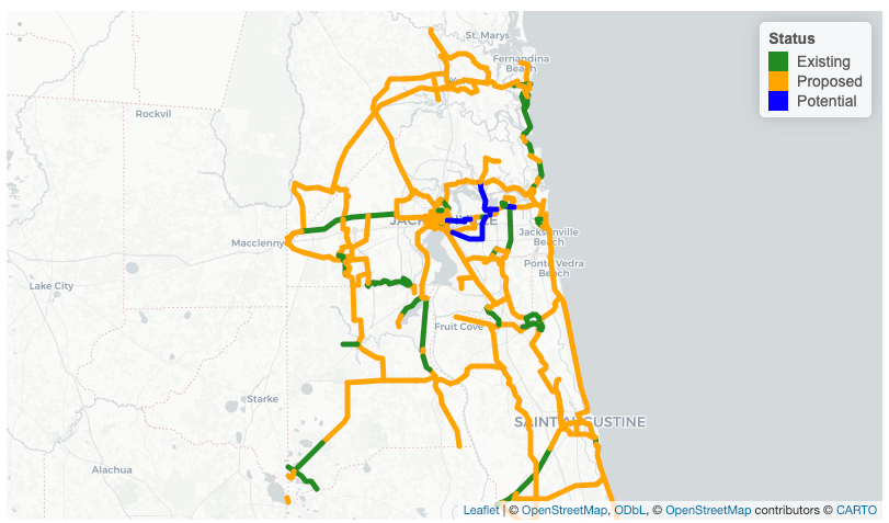 Florida’s Shared-Use Non-motorized (SUN) Trails Network GIS map displays the state’s network of priority paved trails and their associated funding status.